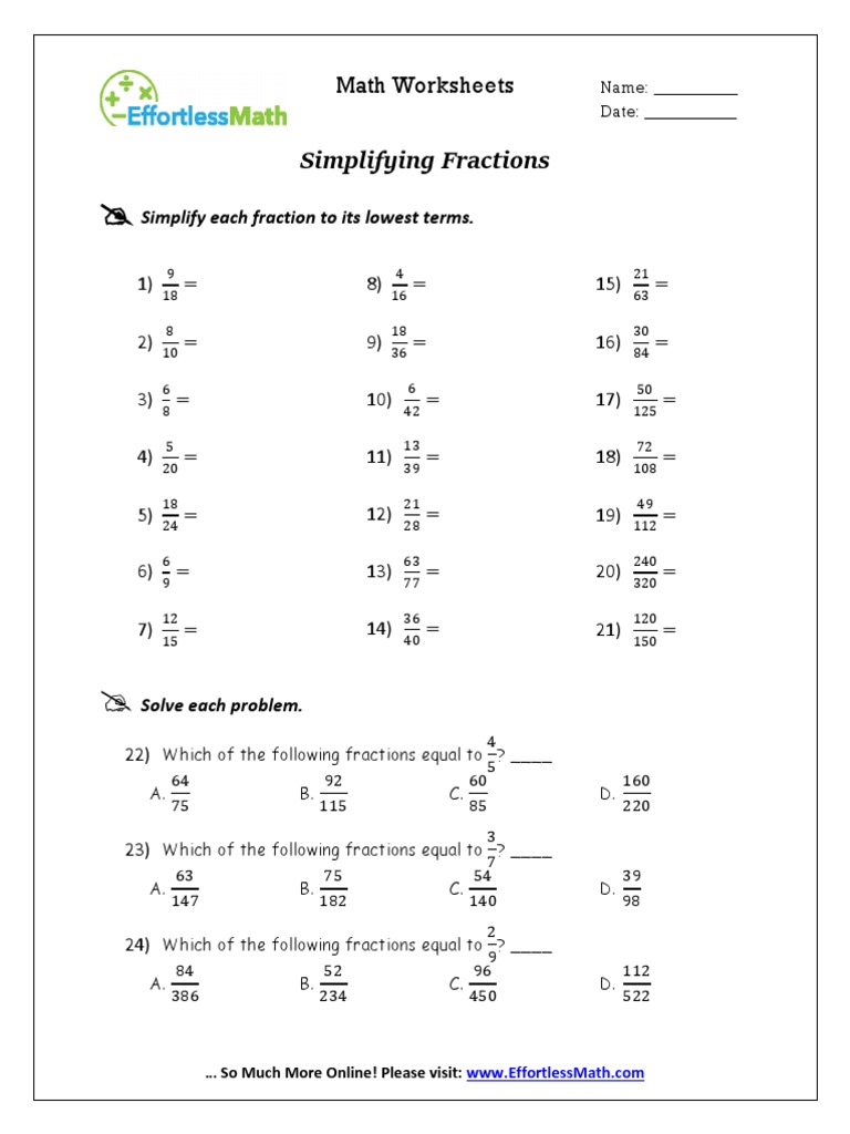 How to Simplify Fractions? (+FREE Worksheet!) - Effortless Math Step by step guide to Simplify Fractions. Step 1: First, find the common factors of the numerator and denominator. Evenly divide both the top and bottom of the fraction by the common factors \ (2, 3, 5, 7\), … etc. Step 2: You should divide the numerator and denominator by the common factors until they no longer be divided by the same whole ...