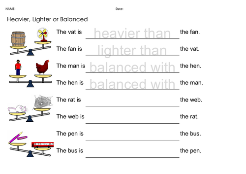 Lighter Or Heavier Worksheets & Teaching Resources | TpT Use this worksheet to develop children's understanding of weight as they decide which objects are heavy and which are light by comparing weights with a balance scale.10 pagesComparing the masses of objects:Comparing objects are from CVC words objects. ... Have students classify their knowledge of heavier and lighter with this math center exit ...